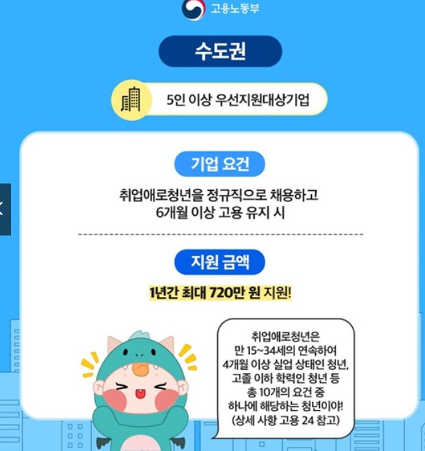 | 수도권 기업 | 5인 이상 우선지원대상기업 | 취업애로청년 정규직 채용 후 6개월 이상 고용 유지 | 기업에 1년간 최대 720만 원 |