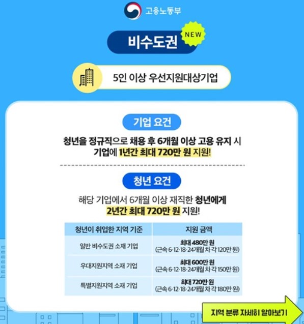 | 비수도권 기업 | 5인 이상 우선지원대상기업 | 청년 정규직 채용 후 6개월 이상 고용 유지 | 기업: 1년간 최대 720만 원 청년: 2년간 최대 720만 원 |
