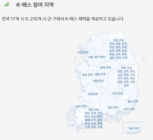 2026년부터 총 218개 기초 지자체 주민이 K-패스 혜택을 누릴 수 있게 되며, 강원·전남·경북의 8개 신규 지자체가 추가 참여합니다.