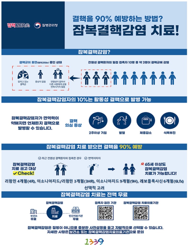 잠복결핵은 감염되어도 증상이 없고 전염되지 않지만, 이후 활성화될 경우 주변 사람에게 전파될 수 있어 사전 예방 치료가 매우 중요 합니다.