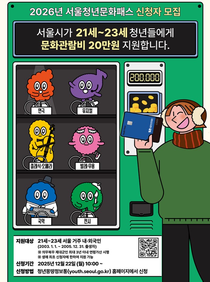 서울시가 2026년에도 ‘서울청년문화패스’를 통해 청년들에게 1인당 20만 원의 문화이용권을 지원합니다. 연극, 뮤지컬, 클래식, 국악 등 다양한 공연·전시 관람 기회를 제공하며, 만 21세~23세 서울 거주 청년이라면 누구나 신청 가능합니다.